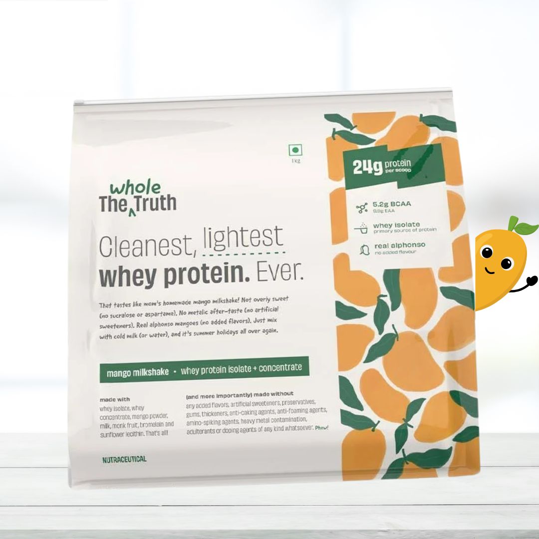 The Whole Truth Whey Protein Isolate + Concentrate 1kg – Mango Milkshake Flavor, 24g Protein per Serving, No Added Sugar